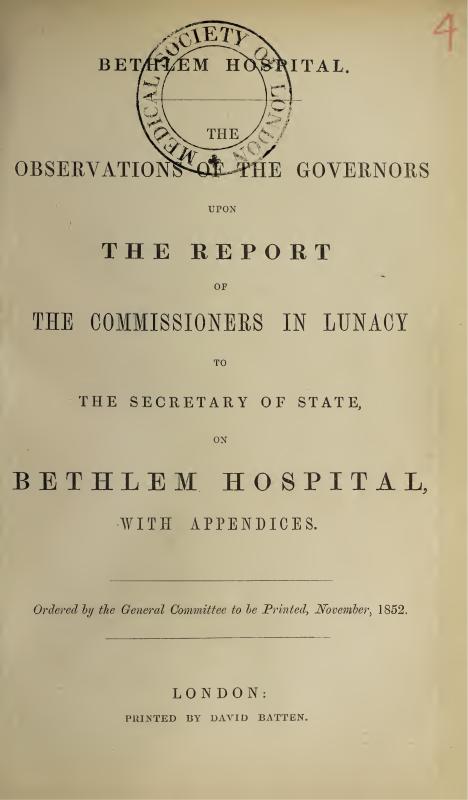We have the honour to transmit to you the accompanying observations of the General Committee for conducting the affairs of the Royal Hospitals of Bridewell and Bethlem, both upon the Report which was laid before the Secretary of State, by the Commissioners in Lunacy, with reference to Bethlem Hospital, and upon the Evidence on which such Report purports to be founded.